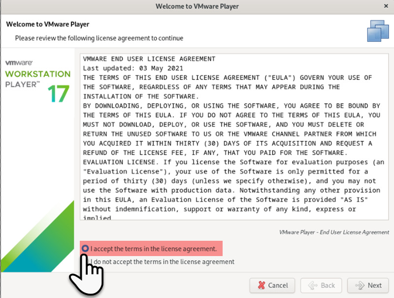 🔶 انقر دبل كليك على ايقونة برنامج Vmware لتشغليه , ستفتح لك اول لوحة هى عرض اتفاقية الترخيص على شاشتك. اقبل الشروط والأحكام وانقر على “التالي” كما تشاهد فى الصورة التالية.