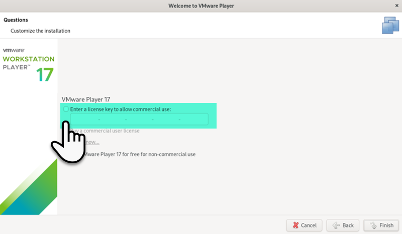 🔶 اختر “Use Vmware Player 17 مجانًا للاستخدام غير التجاري” وانقر على “إنهاء” لإكمال عملية التكوين او قم بأضافة هذا السريال