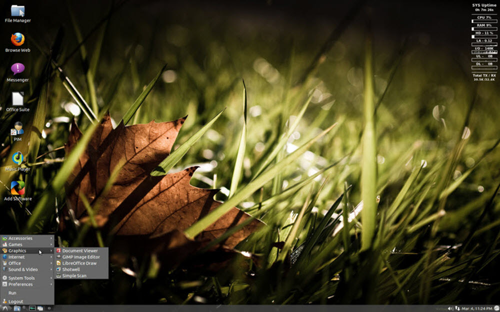 التوزيعة تشتمل على التطبيقات والخدمات الأساسية للاستخدام اليومي، بما في ذلك مجموعة البرامج المكتبية وقارئ PDF ومحرر الصور ومشغلات الوسائط المتعددة.