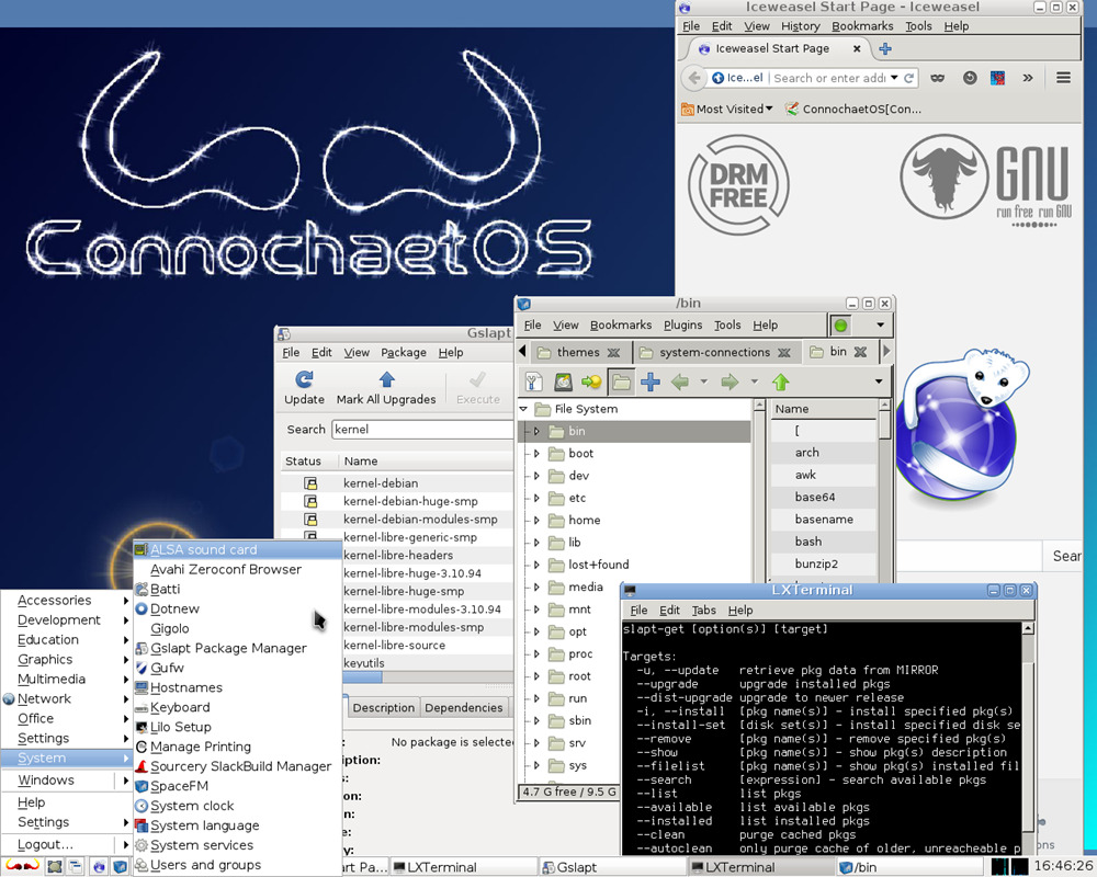 ConnochaetOS هي توزيعة مجانية وهذا يعني أن توزيعة ConnochaetOS لا تحتوي إلا على برامج مجانية ولا تحتوي على برامج خاصة أو غير حرة أو برامج ثابتة.