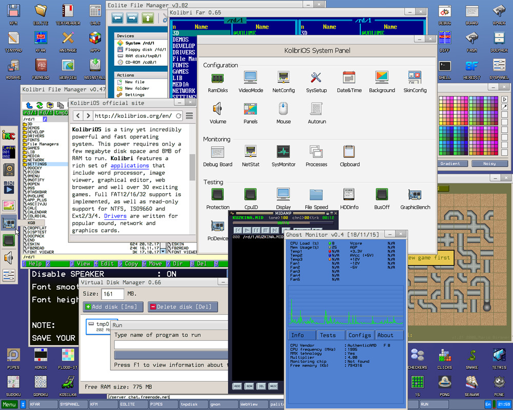 يتميز نظام KolibriOS بمجموعة غنية من التطبيقات التي تتضمن معالج النصوص، وعارض الصور، ومحرر الرسوم البيانية، ومتصفح الويب، وعلى برامج تشغيل فيديو لأجهزة الكمبيوتر ذات البنية 32 بت وأكثر من 30 لعبة.