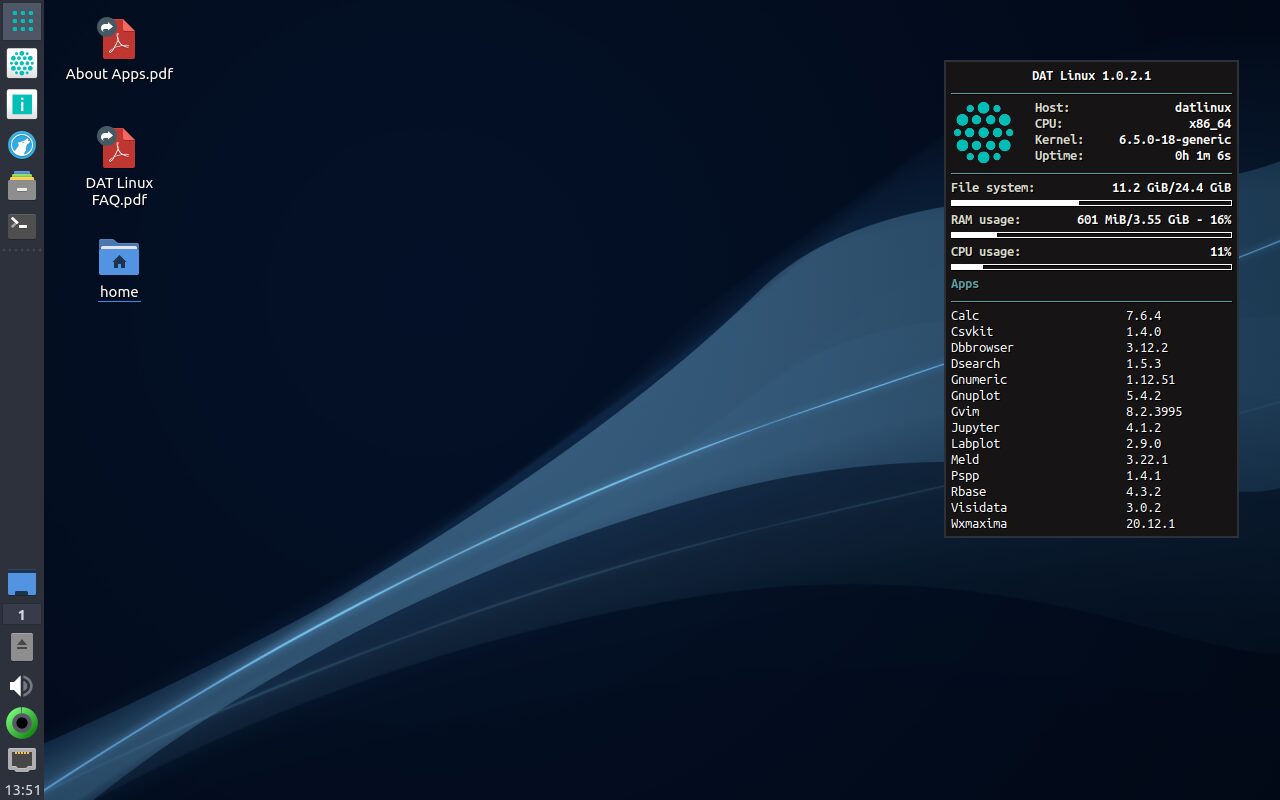 على الرغم من وجود الآلاف من التوزيعات ، فإن DAT Linux فريد من نوعها لأنها مزيج من Lubuntu LTS مع حزم Data Science فقط.