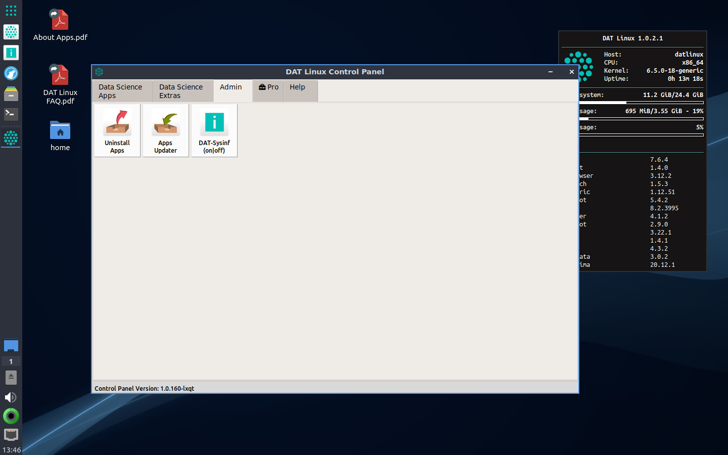 للقيام بذلك، فإنه يجلب لوحة تحكم DAT Linux، وهو مشغل تطبيقات قائم على الشبكة لتطبيقات علوم البيانات مصنفة حسب الوظائف في علامات تبويب منفصلة.