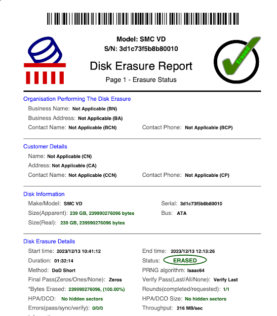 📝 توفر ShredOS القدرة على إنشاء تقارير PDF عند اكتمال عملية المسح ويعد هذا مفيدًا جدًا للحصول على تقرير يوضح تفاصيل محرك الأقراص (الرقم التسلسلي، الطراز، العلامة التجارية، الحجم، ….) ونتيجة المسح.