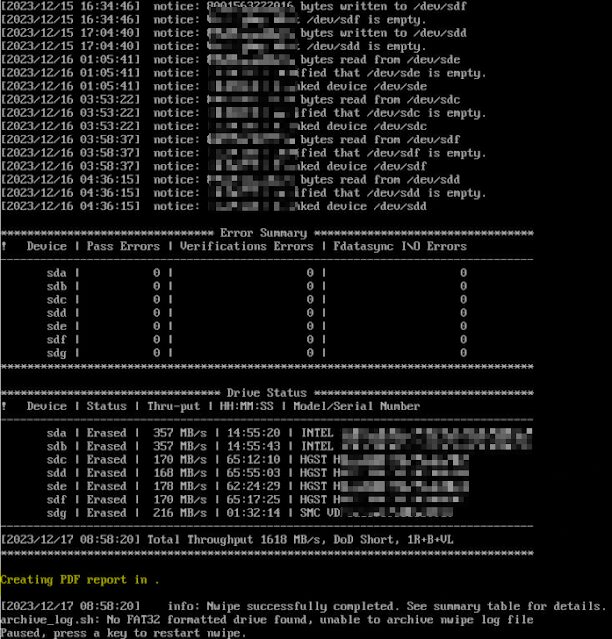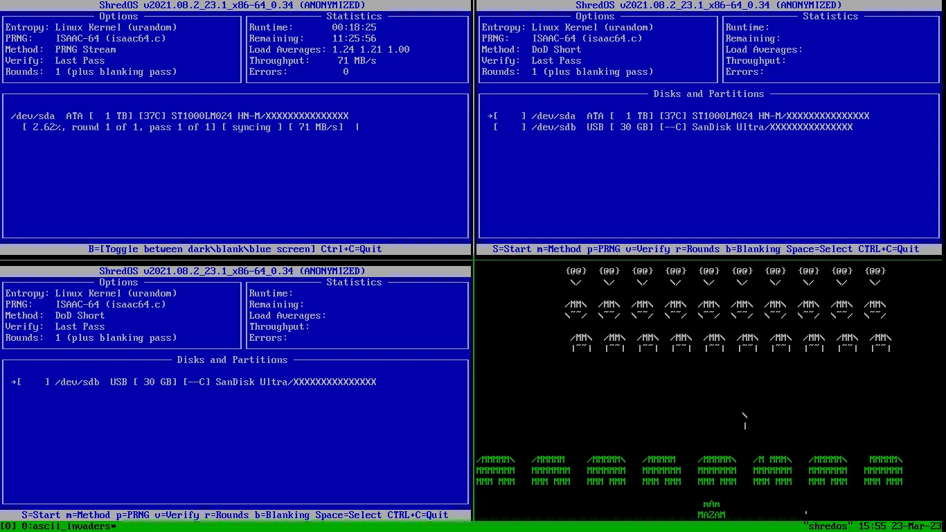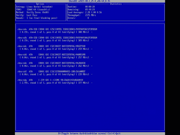 يوفر ShredOS القدرة على تحديد جميع الأقراص وطريقة المسح ثم تبدأ العملية ببساطة ويمكنك نسيانها لبضعة أيام. عندما تعود، يكون قد اكتمل!