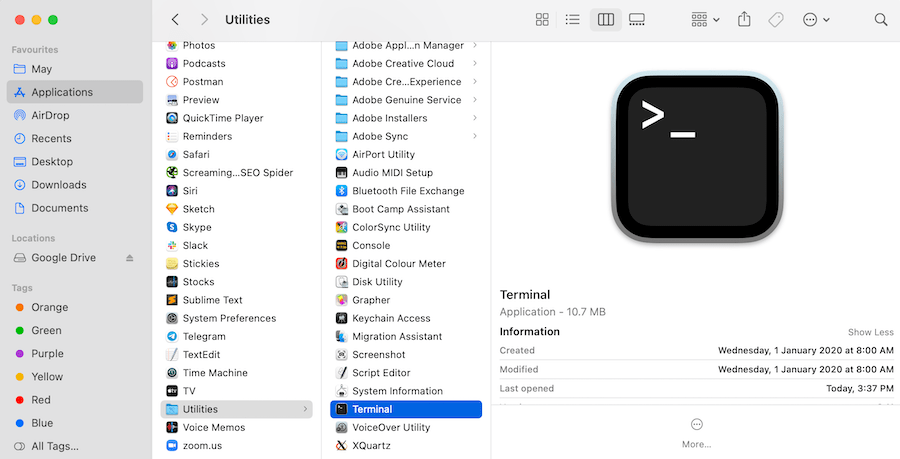 ابحث عن macOS Terminal بواسطة Finder ، ثم مجلد التطبيق ، وصولاً إلى مجلد الأداة المساعدة ، انقر نقرًا مزدوجًا فوق رمز تطبيق Terminal.